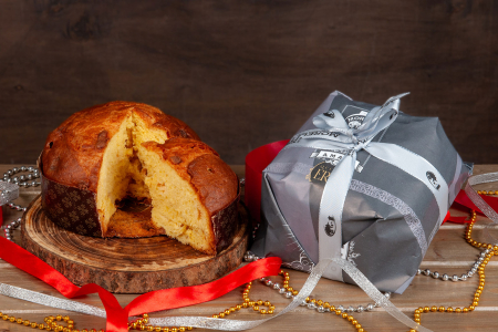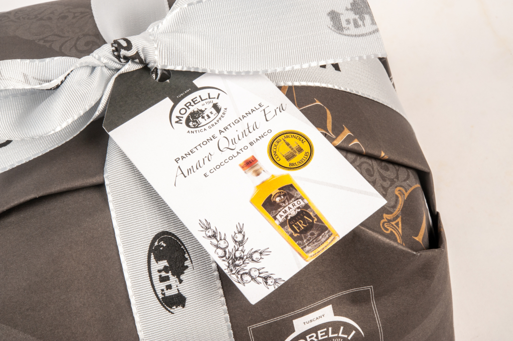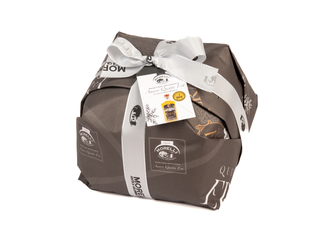 Panettone è realizzato con materie prime di primissima qualità e bagnato con uno sciroppo a base di Amaro Quinta Era, un prodotto che nasce da una base di distillato di gin, posto in infusione con rabarbaro, china, genziana e carciofo. Dal gusto delicato e inconfondibile, il tutto è accompagnato da gocce di cioccolato bianco che ben si equilibrano dando dolcezza al gusto dell’Amaro Quinta Era.